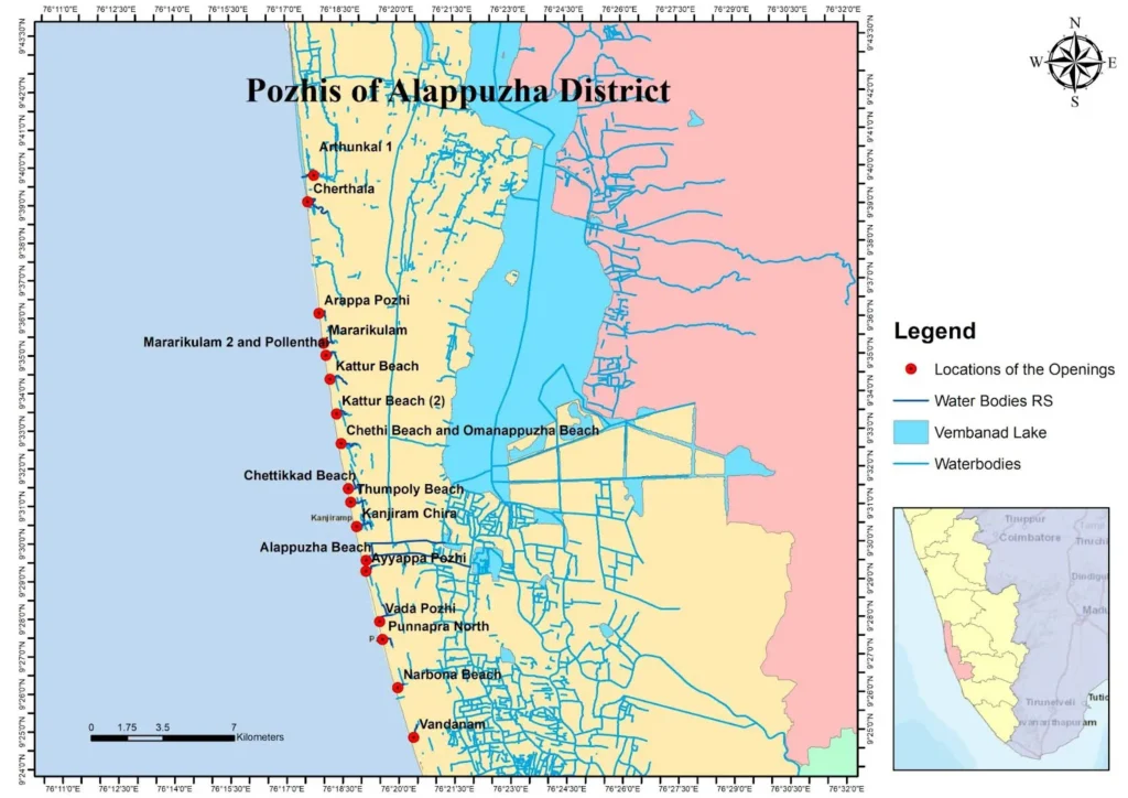 The 2004 tsunami reshaped many of these channels. Many of the pozhis along the Alappuzha coast have undergone significant morphological changes following the 2004 tsunami. The sudden influx of waves caused erosion along the coastal margins, widening several pozhi mouths beyond their natural limits. Post-tsunami, several pozhis have retained these widened channels, altering the coastal-inland hydrodynamic interactions.